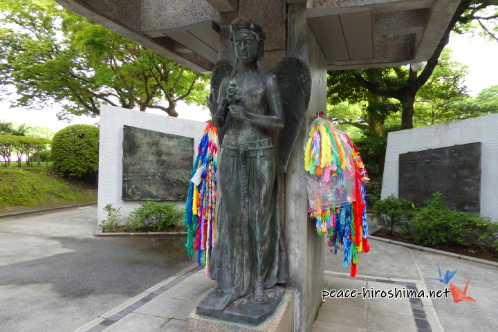 台座付近には、どことなく和洋折衷の風合いの観音像が安置され、周囲には折り鶴が捧げられる。平和への祈りが絶えることはない。